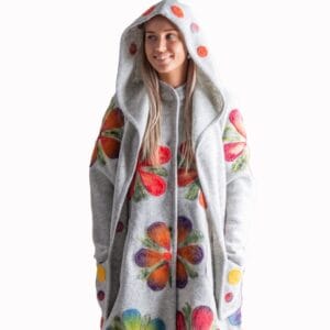 Eco-friendly, waste-free production – the details of the decorations are cut out of the production waste of other capes and installed by needle felting.